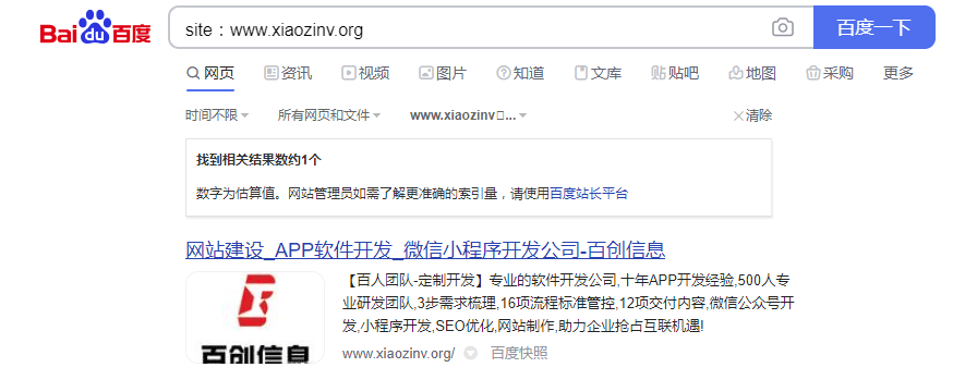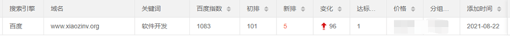 杭州百创信息技术有限公司网站www.xiaozinv.org仅一条收录的新站,直接优化热门关键词“软件开发”,指数1083,提交优化时间为2021年8月22日,经过我们的优化,软件开发已经上第一页.