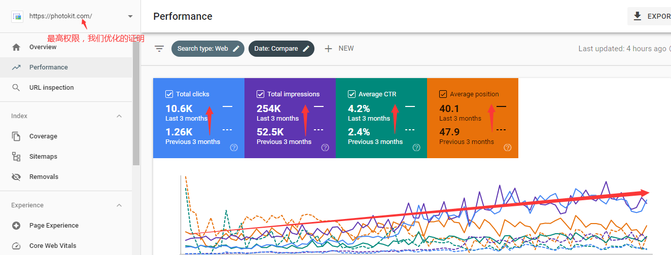 来自google 自带工具webmaster tool,我们优化管理证明:优化3个月,点击次数和展示次数都较上月明显提升