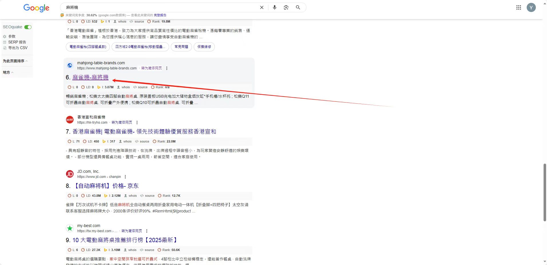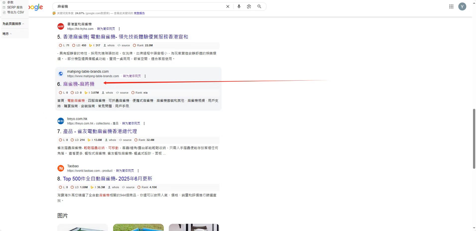 松乐麻将机香港地区繁体中文谷歌SEO推广,核心大词如“麻雀機”、“麻將機”、“電動麻雀機”等热门词排名谷歌搜索首页,而且是在网站上线当日,秒收秒排,上首页仅用不到24小时。